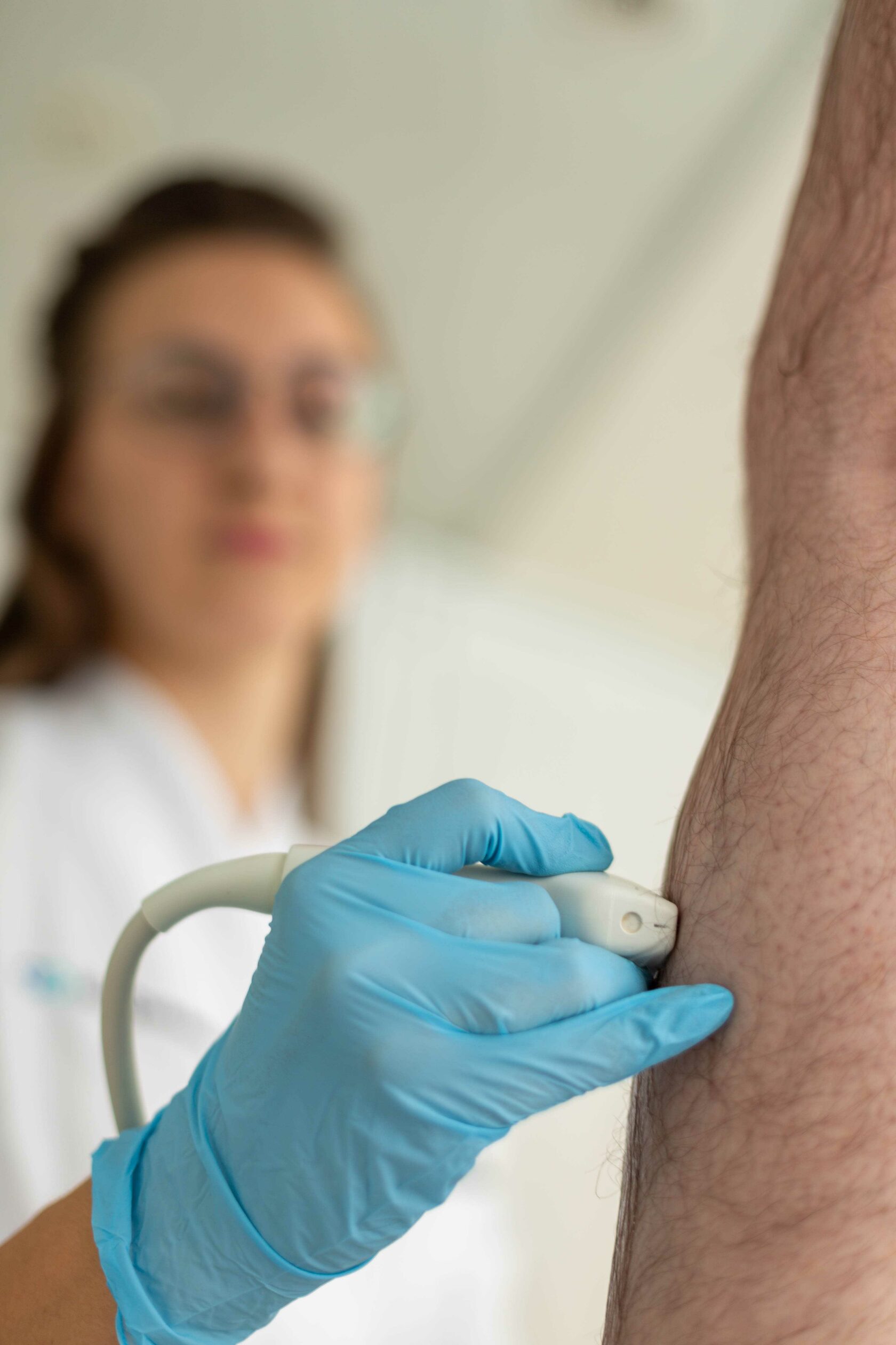 Врач наносит специальный гель на кожу в область исследуемых вен. Гель помогает передавать ультразвуковые волны от датчика к тканям тела.